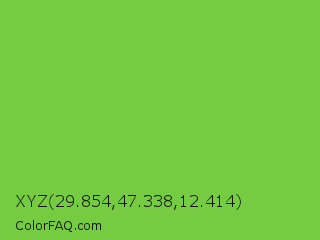 XYZ 29.854,47.338,12.414 Color is a normal green color and the nearest color is Green RYB #66b032. Hex code #75cc40 and RGB value is rgb(117,204,64). In RGB color space, this color is composed of 46% red, 80% green, 25% blue, In CMYK color space, this color is composed of 43% cyan, 0% magenta, 69% yellow , 20% black , In HSL color space, this color has a hue angle of 97° , 58% saturation and 53% lightness.