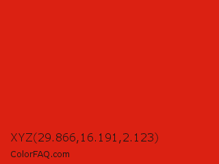 XYZ 29.866,16.191,2.123 Color is a normal red color and the nearest color is Maximum Red #d92121. Hex code #db2112 and RGB value is rgb(219,33,18). In RGB color space, this color is composed of 86% red, 13% green, 7% blue, In CMYK color space, this color is composed of 0% cyan, 85% magenta, 92% yellow , 14% black , In HSL color space, this color has a hue angle of 4° , 85% saturation and 46% lightness.