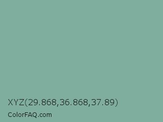 XYZ 29.868,36.868,37.89 Color is a normal green color and the nearest color is Acapulco #7cb0a1. Hex code #7fad9e and RGB value is rgb(127,173,158). In RGB color space, this color is composed of 50% red, 68% green, 62% blue, In CMYK color space, this color is composed of 27% cyan, 0% magenta, 9% yellow , 32% black , In HSL color space, this color has a hue angle of 160° , 22% saturation and 59% lightness.