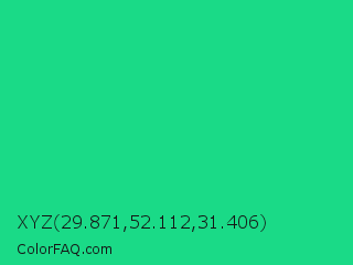 XYZ 29.871,52.112,31.406 Color is a normal green color and the nearest color is Shamrock #33cc99. Hex code #1ada87 and RGB value is rgb(26,218,135). In RGB color space, this color is composed of 10% red, 85% green, 53% blue, In CMYK color space, this color is composed of 88% cyan, 0% magenta, 38% yellow , 15% black , In HSL color space, this color has a hue angle of 154° , 79% saturation and 48% lightness.
