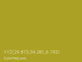 XYZ 29.873,34.281,6.793 Color is a normal yellow color and the nearest color is Lemon Ginger #ac9e22. Hex code #aba125 and RGB value is rgb(171,161,37). In RGB color space, this color is composed of 67% red, 63% green, 15% blue, In CMYK color space, this color is composed of 0% cyan, 6% magenta, 78% yellow , 33% black , In HSL color space, this color has a hue angle of 56° , 64% saturation and 41% lightness.
