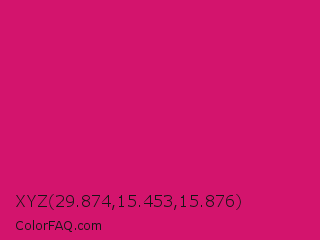 XYZ 29.874,15.453,15.876 Color is a normal rose color and the nearest color is Dogwood Rose #d71868. Hex code #d3146d and RGB value is rgb(211,20,109). In RGB color space, this color is composed of 83% red, 8% green, 43% blue, In CMYK color space, this color is composed of 0% cyan, 91% magenta, 48% yellow , 17% black , In HSL color space, this color has a hue angle of 332° , 83% saturation and 45% lightness.