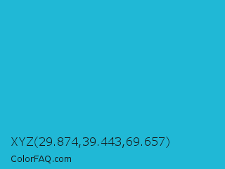 XYZ 29.874,39.443,69.657 Color is a normal cyan color and the nearest color is Battery Charged Blue #1dacd6. Hex code #20b8d6 and RGB value is rgb(32,184,214). In RGB color space, this color is composed of 13% red, 72% green, 84% blue, In CMYK color space, this color is composed of 85% cyan, 14% magenta, 0% yellow , 16% black , In HSL color space, this color has a hue angle of 190° , 74% saturation and 48% lightness.