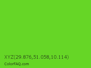 XYZ 29.876,51.058,10.114 Color is a normal green color and the nearest color is Lima #76bd17. Hex code #66d626 and RGB value is rgb(102,214,38). In RGB color space, this color is composed of 40% red, 84% green, 15% blue, In CMYK color space, this color is composed of 52% cyan, 0% magenta, 82% yellow , 16% black , In HSL color space, this color has a hue angle of 98° , 70% saturation and 49% lightness.
