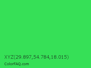 XYZ 29.897,54.784,18.015 Color is a normal green color and the nearest color is UFO Green #3cd070. Hex code #36e057 and RGB value is rgb(54,224,87). In RGB color space, this color is composed of 21% red, 88% green, 34% blue, In CMYK color space, this color is composed of 76% cyan, 0% magenta, 61% yellow , 12% black , In HSL color space, this color has a hue angle of 132° , 73% saturation and 55% lightness.