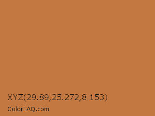 XYZ 29.89,25.272,8.153 Color is a normal orange color and the nearest color is Peru #cd853f. Hex code #c27840 and RGB value is rgb(194,120,64). In RGB color space, this color is composed of 76% red, 47% green, 25% blue, In CMYK color space, this color is composed of 0% cyan, 38% magenta, 67% yellow , 24% black , In HSL color space, this color has a hue angle of 26° , 52% saturation and 51% lightness.