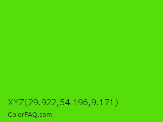 XYZ 29.922,54.196,9.171 Color is a normal green color and the nearest color is Harlequin Green #46cb18. Hex code #55de0a and RGB value is rgb(85,222,10). In RGB color space, this color is composed of 33% red, 87% green, 4% blue, In CMYK color space, this color is composed of 62% cyan, 0% magenta, 95% yellow , 13% black , In HSL color space, this color has a hue angle of 99° , 91% saturation and 45% lightness.