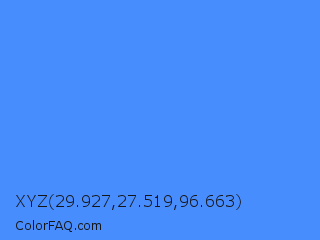 XYZ 29.927,27.519,96.663 Color is a light blue color and the nearest color is Blueberry #4f86f7. Hex code #488dfd and RGB value is rgb(72,141,253). In RGB color space, this color is composed of 28% red, 55% green, 99% blue, In CMYK color space, this color is composed of 72% cyan, 44% magenta, 0% yellow , 1% black , In HSL color space, this color has a hue angle of 217° , 98% saturation and 64% lightness.