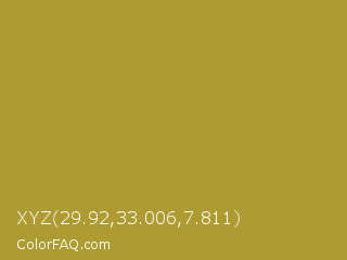 XYZ 29.92,33.006,7.811 Color is a normal yellow color and the nearest color is Alpine #af8f2c. Hex code #ae9c32 and RGB value is rgb(174,156,50). In RGB color space, this color is composed of 68% red, 61% green, 20% blue, In CMYK color space, this color is composed of 0% cyan, 10% magenta, 71% yellow , 32% black , In HSL color space, this color has a hue angle of 51° , 55% saturation and 44% lightness.