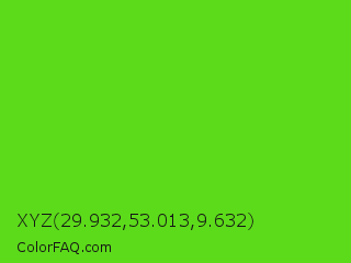 XYZ 29.932,53.013,9.632 Color is a normal green color and the nearest color is Harlequin Green #46cb18. Hex code #5cdb1a and RGB value is rgb(92,219,26). In RGB color space, this color is composed of 36% red, 86% green, 10% blue, In CMYK color space, this color is composed of 58% cyan, 0% magenta, 88% yellow , 14% black , In HSL color space, this color has a hue angle of 99° , 79% saturation and 48% lightness.