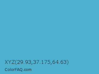 XYZ 29.93,37.175,64.63 Color is a normal blue color and the nearest color is Shakespeare #4eabd1. Hex code #4eb0cf and RGB value is rgb(78,176,207). In RGB color space, this color is composed of 31% red, 69% green, 81% blue, In CMYK color space, this color is composed of 62% cyan, 15% magenta, 0% yellow , 19% black , In HSL color space, this color has a hue angle of 194° , 57% saturation and 56% lightness.