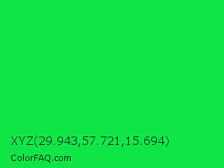 XYZ 29.943,57.721,15.694 Color is a normal green color and the nearest color is Malachite #0bda51. Hex code #0fe748 and RGB value is rgb(15,231,72). In RGB color space, this color is composed of 6% red, 91% green, 28% blue, In CMYK color space, this color is composed of 94% cyan, 0% magenta, 69% yellow , 9% black , In HSL color space, this color has a hue angle of 136° , 88% saturation and 48% lightness.
