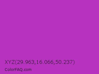 XYZ 29.963,16.066,50.237 Color is a normal magenta color and the nearest color is Steel Pink #cc33cc. Hex code #b732be and RGB value is rgb(183,50,190). In RGB color space, this color is composed of 72% red, 20% green, 75% blue, In CMYK color space, this color is composed of 4% cyan, 74% magenta, 0% yellow , 25% black , In HSL color space, this color has a hue angle of 297° , 58% saturation and 47% lightness.