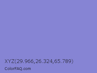 XYZ 29.966,26.324,65.789 Color is a light indigo color and the nearest color is Chetwode Blue #8581d9. Hex code #8684d4 and RGB value is rgb(134,132,212). In RGB color space, this color is composed of 53% red, 52% green, 83% blue, In CMYK color space, this color is composed of 37% cyan, 38% magenta, 0% yellow , 17% black , In HSL color space, this color has a hue angle of 242° , 48% saturation and 67% lightness.