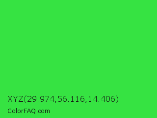 XYZ 29.974,56.116,14.406 Color is a normal green color and the nearest color is Lime Green #32cd32. Hex code #36e342 and RGB value is rgb(54,227,66). In RGB color space, this color is composed of 21% red, 89% green, 26% blue, In CMYK color space, this color is composed of 76% cyan, 0% magenta, 71% yellow , 11% black , In HSL color space, this color has a hue angle of 124° , 76% saturation and 55% lightness.