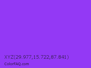 XYZ 29.977,15.722,87.841 Color is a normal violet color and the nearest color is Blue Violet #8a2be2. Hex code #9339f5 and RGB value is rgb(147,57,245). In RGB color space, this color is composed of 58% red, 22% green, 96% blue, In CMYK color space, this color is composed of 40% cyan, 77% magenta, 0% yellow , 4% black , In HSL color space, this color has a hue angle of 269° , 90% saturation and 59% lightness.