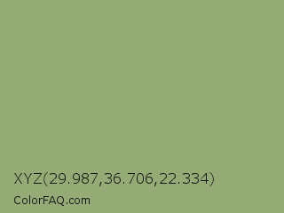 XYZ 29.987,36.706,22.334 Color is a normal green color and the nearest color is Olivine #9ab973. Hex code #94ab75 and RGB value is rgb(148,171,117). In RGB color space, this color is composed of 58% red, 67% green, 46% blue, In CMYK color space, this color is composed of 13% cyan, 0% magenta, 32% yellow , 33% black , In HSL color space, this color has a hue angle of 86° , 24% saturation and 56% lightness.