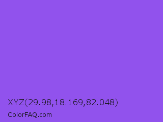 XYZ 29.98,18.169,82.048 Color is a light violet color and the nearest color is Navy Purple #9457eb. Hex code #9152ed and RGB value is rgb(145,82,237). In RGB color space, this color is composed of 57% red, 32% green, 93% blue, In CMYK color space, this color is composed of 39% cyan, 65% magenta, 0% yellow , 7% black , In HSL color space, this color has a hue angle of 264° , 81% saturation and 63% lightness.