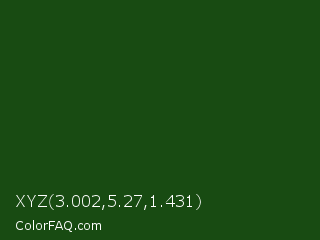 XYZ 3.002,5.27,1.431 Color is a very dark green color and the nearest color is Parsley #134f19. Hex code #184b12 and RGB value is rgb(24,75,18). In RGB color space, this color is composed of 9% red, 29% green, 7% blue, In CMYK color space, this color is composed of 68% cyan, 0% magenta, 76% yellow , 71% black , In HSL color space, this color has a hue angle of 114° , 61% saturation and 18% lightness.