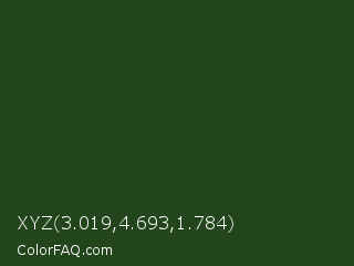 XYZ 3.019,4.693,1.784 Color is a very dark green color and the nearest color is Green House #24500f. Hex code #23451b and RGB value is rgb(35,69,27). In RGB color space, this color is composed of 14% red, 27% green, 11% blue, In CMYK color space, this color is composed of 49% cyan, 0% magenta, 61% yellow , 73% black , In HSL color space, this color has a hue angle of 109° , 44% saturation and 19% lightness.