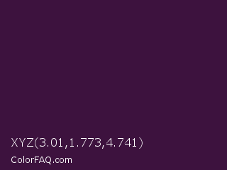 XYZ 3.01,1.773,4.741 Color is a very dark magenta color and the nearest color is Valentino #350e42. Hex code #3d123e and RGB value is rgb(61,18,62). In RGB color space, this color is composed of 24% red, 7% green, 24% blue, In CMYK color space, this color is composed of 2% cyan, 71% magenta, 0% yellow , 76% black , In HSL color space, this color has a hue angle of 299° , 55% saturation and 16% lightness.
