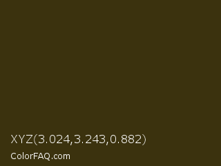 XYZ 3.024,3.243,0.882 Color is a very dark yellow color and the nearest color is Camouflage #3c3910. Hex code #3b320e and RGB value is rgb(59,50,14). In RGB color space, this color is composed of 23% red, 20% green, 5% blue, In CMYK color space, this color is composed of 0% cyan, 15% magenta, 76% yellow , 77% black , In HSL color space, this color has a hue angle of 48° , 62% saturation and 14% lightness.