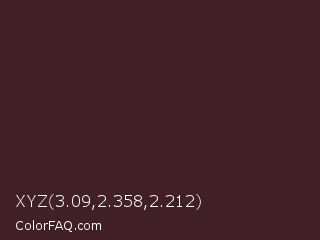 XYZ 3.09,2.358,2.212 Color is a very dark red color and the nearest color is Crater Brown #462425. Hex code #412127 and RGB value is rgb(65,33,39). In RGB color space, this color is composed of 25% red, 13% green, 15% blue, In CMYK color space, this color is composed of 0% cyan, 49% magenta, 40% yellow , 75% black , In HSL color space, this color has a hue angle of 349° , 33% saturation and 19% lightness.
