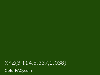 XYZ 3.114,5.337,1.038 Color is a very dark green color and the nearest color is Green House #24500f. Hex code #1f4b06 and RGB value is rgb(31,75,6). In RGB color space, this color is composed of 12% red, 29% green, 2% blue, In CMYK color space, this color is composed of 59% cyan, 0% magenta, 92% yellow , 71% black , In HSL color space, this color has a hue angle of 98° , 85% saturation and 16% lightness.