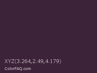 XYZ 3.264,2.49,4.179 Color is a very dark magenta color and the nearest color is Blackcurrant #32293a. Hex code #3d2339 and RGB value is rgb(61,35,57). In RGB color space, this color is composed of 24% red, 14% green, 22% blue, In CMYK color space, this color is composed of 0% cyan, 43% magenta, 7% yellow , 76% black , In HSL color space, this color has a hue angle of 309° , 27% saturation and 19% lightness.