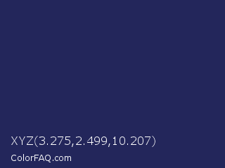 XYZ 3.275,2.499,10.207 Color is a dark blue color and the nearest color is Cloud Burst #202e54. Hex code #23265b and RGB value is rgb(35,38,91). In RGB color space, this color is composed of 14% red, 15% green, 36% blue, In CMYK color space, this color is composed of 62% cyan, 58% magenta, 0% yellow , 64% black , In HSL color space, this color has a hue angle of 237° , 44% saturation and 25% lightness.