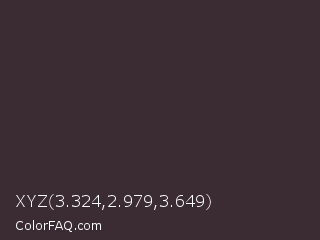XYZ 3.324,2.979,3.649 Color is a very dark rose color and the nearest color is Dune #383533. Hex code #3b2c34 and RGB value is rgb(59,44,52). In RGB color space, this color is composed of 23% red, 17% green, 20% blue, In CMYK color space, this color is composed of 0% cyan, 25% magenta, 12% yellow , 77% black , In HSL color space, this color has a hue angle of 328° , 15% saturation and 20% lightness.