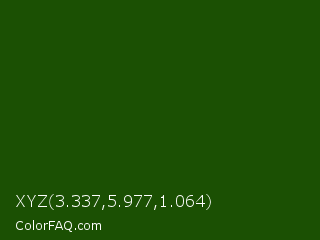 XYZ 3.337,5.977,1.064 Color is a very dark green color and the nearest color is Lincoln Green #195905. Hex code #1b5003 and RGB value is rgb(27,80,3). In RGB color space, this color is composed of 11% red, 31% green, 1% blue, In CMYK color space, this color is composed of 66% cyan, 0% magenta, 96% yellow , 69% black , In HSL color space, this color has a hue angle of 101° , 93% saturation and 16% lightness.