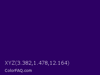 XYZ 3.382,1.478,12.164 Color is a very dark violet color and the nearest color is Deep Violet #330066. Hex code #2d0064 and RGB value is rgb(45,0,100). In RGB color space, this color is composed of 18% red, 0% green, 39% blue, In CMYK color space, this color is composed of 55% cyan, 100% magenta, 0% yellow , 61% black , In HSL color space, this color has a hue angle of 267° , 100% saturation and 20% lightness.