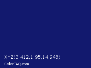 XYZ 3.412,1.95,14.948 Color is a dark blue color and the nearest color is Midnight Blue #191970. Hex code #12196e and RGB value is rgb(18,25,110). In RGB color space, this color is composed of 7% red, 10% green, 43% blue, In CMYK color space, this color is composed of 84% cyan, 77% magenta, 0% yellow , 57% black , In HSL color space, this color has a hue angle of 235° , 72% saturation and 25% lightness.