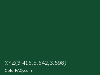 XYZ 3.416,5.642,3.598 Color is a very dark green color and the nearest color is Cal Poly Pomona Green #1e4d2b. Hex code #124d2f and RGB value is rgb(18,77,47). In RGB color space, this color is composed of 7% red, 30% green, 18% blue, In CMYK color space, this color is composed of 77% cyan, 0% magenta, 39% yellow , 70% black , In HSL color space, this color has a hue angle of 149° , 62% saturation and 19% lightness.