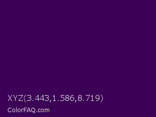XYZ 3.443,1.586,8.719 Color is a very dark purple color and the nearest color is Ripe Plum #410056. Hex code #3b0055 and RGB value is rgb(59,0,85). In RGB color space, this color is composed of 23% red, 0% green, 33% blue, In CMYK color space, this color is composed of 31% cyan, 100% magenta, 0% yellow , 67% black , In HSL color space, this color has a hue angle of 282° , 100% saturation and 17% lightness.