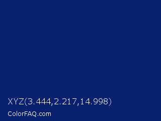 XYZ 3.444,2.217,14.998 Color is a dark blue color and the nearest color is Deep Sapphire #082567. Hex code #09206e and RGB value is rgb(9,32,110). In RGB color space, this color is composed of 4% red, 13% green, 43% blue, In CMYK color space, this color is composed of 92% cyan, 71% magenta, 0% yellow , 57% black , In HSL color space, this color has a hue angle of 226° , 85% saturation and 23% lightness.