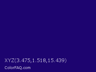XYZ 3.475,1.518,15.439 Color is a dark indigo color and the nearest color is Deep Blue #220878. Hex code #1d0470 and RGB value is rgb(29,4,112). In RGB color space, this color is composed of 11% red, 2% green, 44% blue, In CMYK color space, this color is composed of 74% cyan, 96% magenta, 0% yellow , 56% black , In HSL color space, this color has a hue angle of 254° , 93% saturation and 23% lightness.