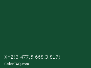 XYZ 3.477,5.668,3.817 Color is a very dark green color and the nearest color is Cal Poly Pomona Green #1e4d2b. Hex code #134d31 and RGB value is rgb(19,77,49). In RGB color space, this color is composed of 7% red, 30% green, 19% blue, In CMYK color space, this color is composed of 75% cyan, 0% magenta, 36% yellow , 70% black , In HSL color space, this color has a hue angle of 151° , 60% saturation and 19% lightness.