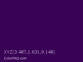 XYZ 3.487,1.631,9.148 Color is a very dark purple color and the nearest color is Ripe Plum #410056. Hex code #3a0257 and RGB value is rgb(58,2,87). In RGB color space, this color is composed of 23% red, 1% green, 34% blue, In CMYK color space, this color is composed of 33% cyan, 98% magenta, 0% yellow , 66% black , In HSL color space, this color has a hue angle of 280° , 96% saturation and 17% lightness.