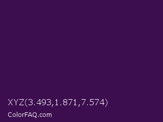 XYZ 3.493,1.871,7.574 Color is a very dark purple color and the nearest color is Jagger #350e57. Hex code #3d0e4f and RGB value is rgb(61,14,79). In RGB color space, this color is composed of 24% red, 5% green, 31% blue, In CMYK color space, this color is composed of 23% cyan, 82% magenta, 0% yellow , 69% black , In HSL color space, this color has a hue angle of 283° , 70% saturation and 18% lightness.