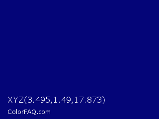 XYZ 3.495,1.49,17.873 Color is a dark blue color and the nearest color is Navy Blue #000080. Hex code #040578 and RGB value is rgb(4,5,120). In RGB color space, this color is composed of 2% red, 2% green, 47% blue, In CMYK color space, this color is composed of 97% cyan, 96% magenta, 0% yellow , 53% black , In HSL color space, this color has a hue angle of 239° , 94% saturation and 24% lightness.