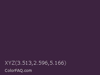 XYZ 3.513,2.596,5.166 Color is a very dark magenta color and the nearest color is Blackcurrant #32293a. Hex code #3e2340 and RGB value is rgb(62,35,64). In RGB color space, this color is composed of 24% red, 14% green, 25% blue, In CMYK color space, this color is composed of 3% cyan, 45% magenta, 0% yellow , 75% black , In HSL color space, this color has a hue angle of 296° , 29% saturation and 19% lightness.