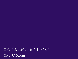 XYZ 3.534,1.8,11.716 Color is a very dark violet color and the nearest color is Violent Violet #290c5e. Hex code #2f0e62 and RGB value is rgb(47,14,98). In RGB color space, this color is composed of 18% red, 5% green, 38% blue, In CMYK color space, this color is composed of 52% cyan, 86% magenta, 0% yellow , 62% black , In HSL color space, this color has a hue angle of 264° , 75% saturation and 22% lightness.