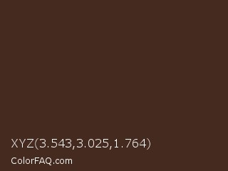 XYZ 3.543,3.025,1.764 Color is a very dark orange color and the nearest color is Cork #40291d. Hex code #452a20 and RGB value is rgb(69,42,32). In RGB color space, this color is composed of 27% red, 16% green, 13% blue, In CMYK color space, this color is composed of 0% cyan, 39% magenta, 54% yellow , 73% black , In HSL color space, this color has a hue angle of 16° , 37% saturation and 20% lightness.