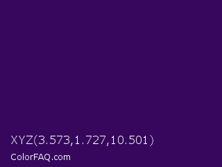 XYZ 3.573,1.727,10.501 Color is a very dark purple color and the nearest color is Jagger #350e57. Hex code #36075d and RGB value is rgb(54,7,93). In RGB color space, this color is composed of 21% red, 3% green, 36% blue, In CMYK color space, this color is composed of 42% cyan, 92% magenta, 0% yellow , 64% black , In HSL color space, this color has a hue angle of 273° , 86% saturation and 20% lightness.