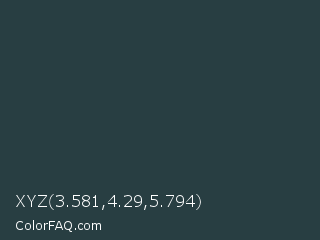 XYZ 3.581,4.29,5.794 Color is a very dark cyan color and the nearest color is Japanese Indigo #264348. Hex code #283e42 and RGB value is rgb(40,62,66). In RGB color space, this color is composed of 16% red, 24% green, 26% blue, In CMYK color space, this color is composed of 39% cyan, 6% magenta, 0% yellow , 74% black , In HSL color space, this color has a hue angle of 189° , 25% saturation and 21% lightness.