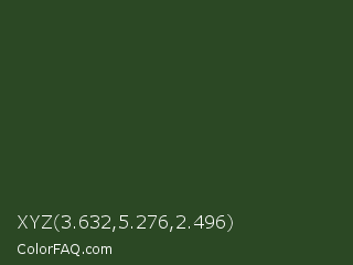 XYZ 3.632,5.276,2.496 Color is a very dark green color and the nearest color is Cal Poly Pomona Green #1e4d2b. Hex code #2b4824 and RGB value is rgb(43,72,36). In RGB color space, this color is composed of 17% red, 28% green, 14% blue, In CMYK color space, this color is composed of 40% cyan, 0% magenta, 50% yellow , 72% black , In HSL color space, this color has a hue angle of 108° , 33% saturation and 21% lightness.