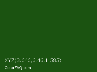 XYZ 3.646,6.46,1.585 Color is a very dark green color and the nearest color is Green House #24500f. Hex code #1b5311 and RGB value is rgb(27,83,17). In RGB color space, this color is composed of 11% red, 33% green, 7% blue, In CMYK color space, this color is composed of 67% cyan, 0% magenta, 80% yellow , 67% black , In HSL color space, this color has a hue angle of 111° , 66% saturation and 20% lightness.