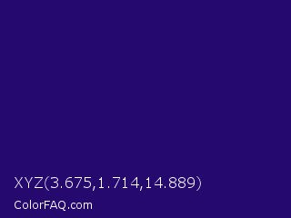 XYZ 3.675,1.714,14.889 Color is a dark indigo color and the nearest color is Paris M #26056a. Hex code #25096e and RGB value is rgb(37,9,110). In RGB color space, this color is composed of 15% red, 4% green, 43% blue, In CMYK color space, this color is composed of 66% cyan, 92% magenta, 0% yellow , 57% black , In HSL color space, this color has a hue angle of 257° , 85% saturation and 23% lightness.